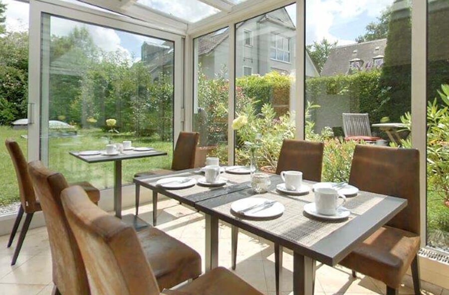 In unserem liebevoll eingerichteten Frühstücksraum mit Kachelofen und Wintergarten können Sie den Tag mit einem großzügigen Frühstück beginnen.